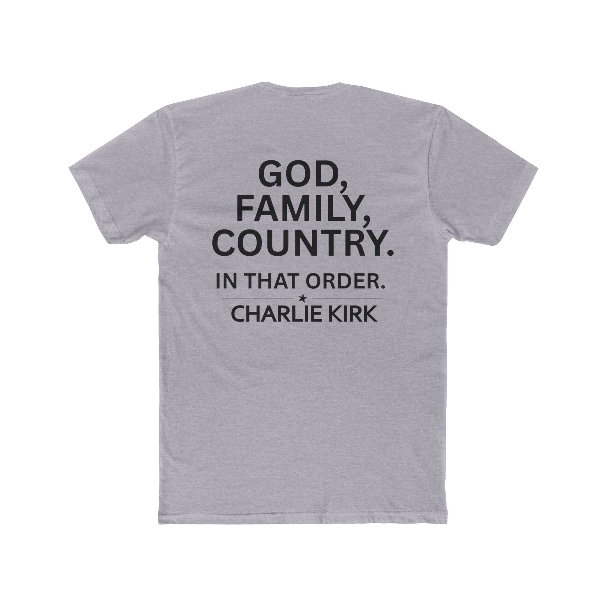A stylish unisex cotton crew tee featuring a design inspired by Charlie Kirk's values. This tee is perfect for those who share similar values and want to express them through their clothing. It's a versatile piece that can be worn casually or at semi-formal events, making it a great addition to any wardrobe. Ideal for adults, this tee is made with high-quality materials for long-lasting comfort.