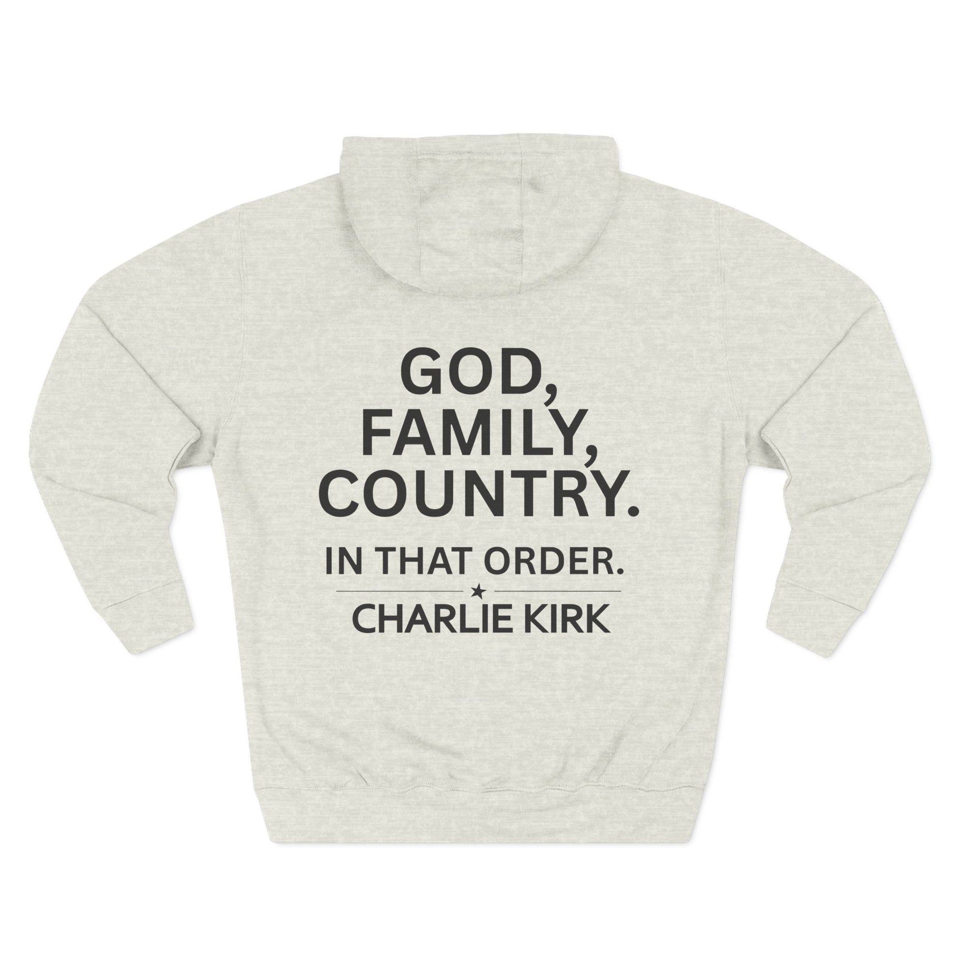 Stay cozy while expressing your values with this Three-Panel Fleece Hoodie. Its soft, luxurious fabric makes it the perfect companion for chilly days, whether you're lounging at home or out with friends. With adjustable drawstrings and a spacious kangaroo pocket, it provides both comfort and functionality. Ideal for anyone who appreciates a stylish yet meaningful wardrobe piece, this hoodie is perfect for casual outings, family gatherings, or cozy evenings. Celebrate your principles during holidays like Thanksgiving or family-centric events, and make it a thoughtful gift for those who cherish family, freedom, and a sense of community.